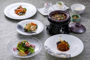 | 「進化系中華料理」がコンセプトのモダンチャイニーズレストランが提案するのは、「ランチコースオーキッド」。メインとなるのは、揚げトンポーローと大分県産のジャンボ椎茸を贅沢に使用した黒酢酢豚。肉厚で風味豊かなジャンボ椎茸が、トンポーローの旨みを引き立たせる。地元の新鮮な食材を活かした料理で、優雅なランチを楽しんで。 |